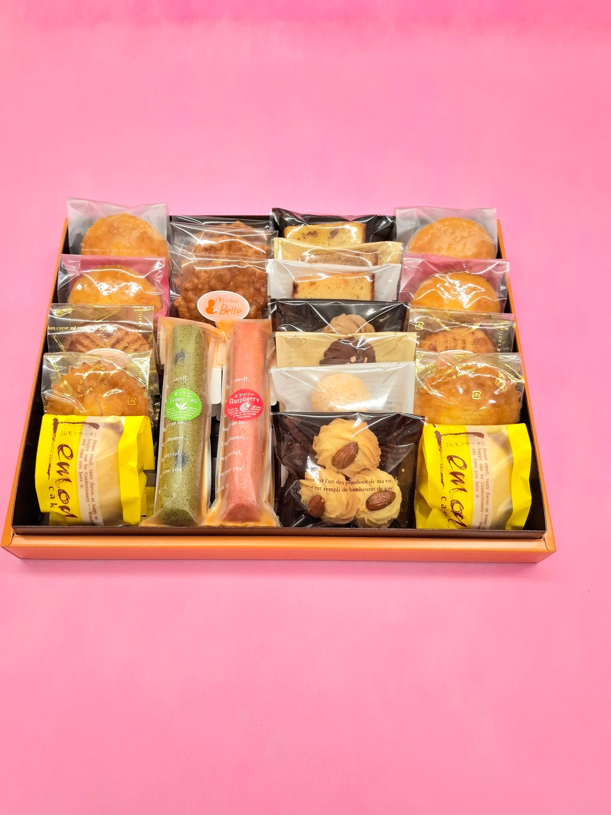 お菓子のアトリエBelle が職人が1つ1つ心を込めた焼き菓子が色々詰め合わせました。 クッキー4個、パウンドケーキ3個、バターケーキ8個、ガレット2個、スティックフィナンシェ4個、リーフパイ3個 計24個